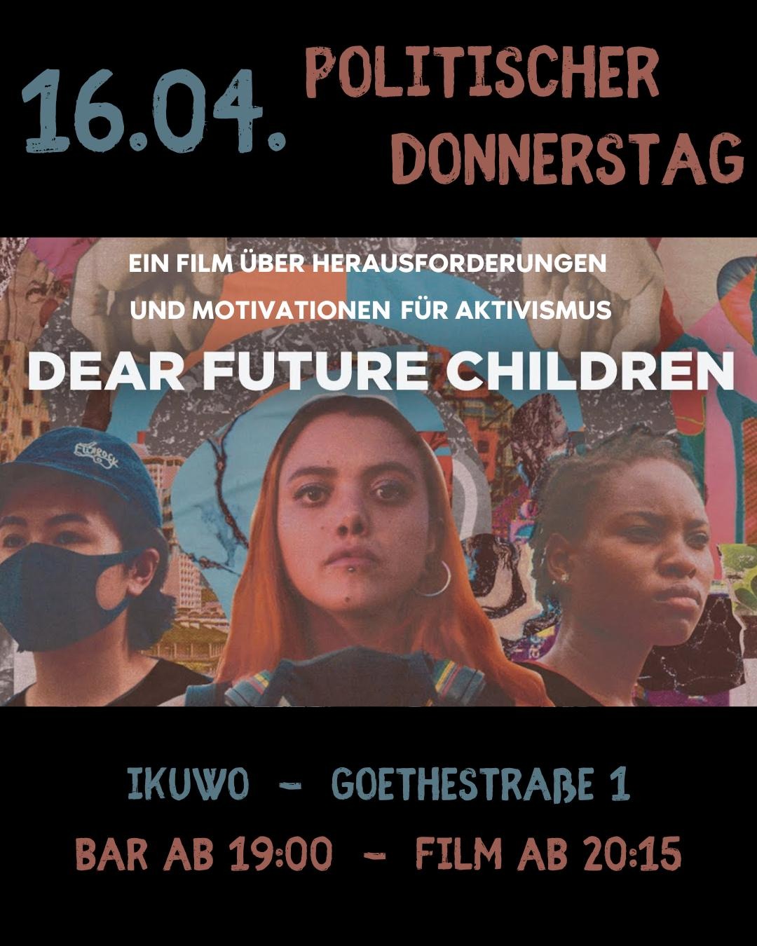 20:15 öffnen wir den (Kino)Saal für euch und zeigen den Film „Dear Future Children“. Natürlich gibt´s auch Popcorn!